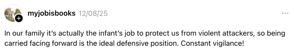 Others gently reminded the original poster that babies are, in fact, not optional accessories that can simply be set down in case of emergency like a gym bag. If danger strikes, most parents aren’t thinking, “Ah yes, my combat stance,” but rather, “Protect the baby at all costs.” Which, coincidentally, is exactly what baby-wearing is designed to do. Secure the infant. Keep hands mostly free. Avoid dropping said infant during chaos. Revolutionary stuff.