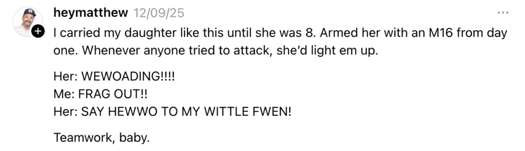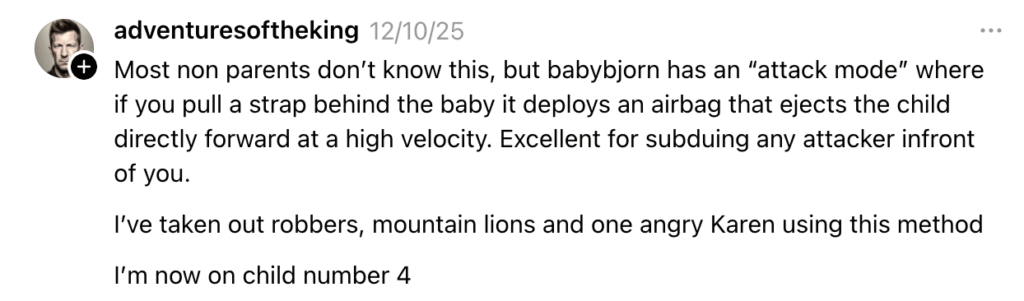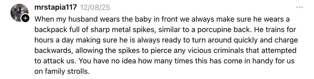 Ultimately, the thread became less about personal safety and more about the internet’s enduring talent for inventing problems where none exist. Because if dads had to choose between bonding with their newborns and preparing for a hypothetical action-movie ambush in the frozen foods aisle, most parents would still pick the carrier.
