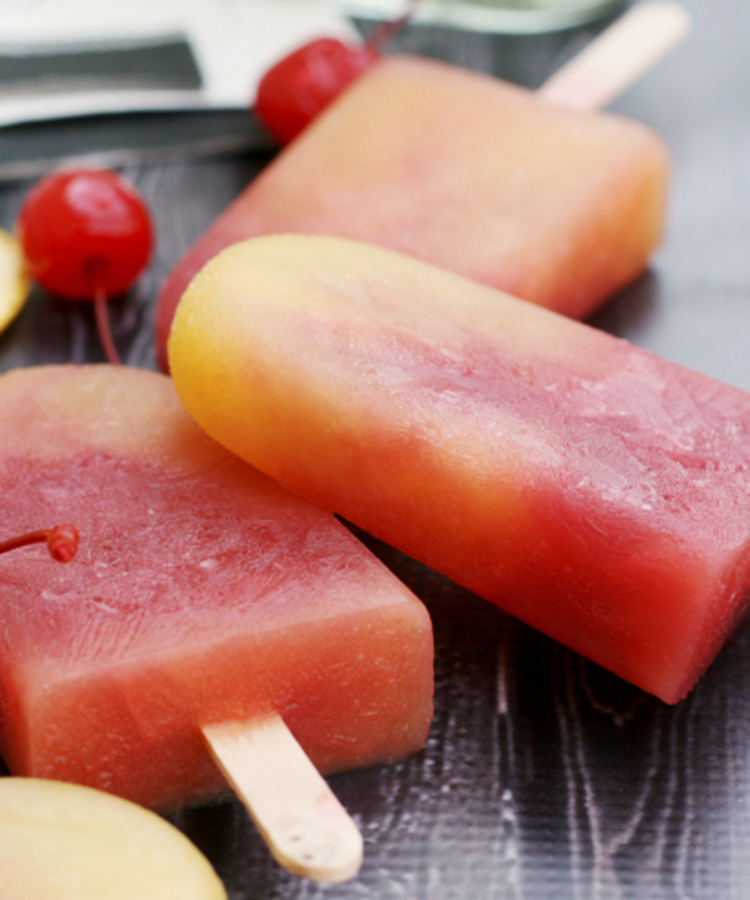 Tequila Sunrise Ice Pops: A classic summer cocktail—now available on a stick! Girlichef layered fresh orange juice, tequila and grenadine in these pretty and refreshing popsicles.