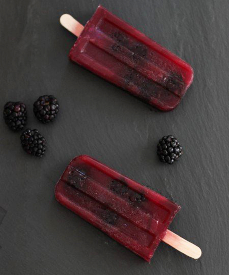 Pomegranate-Merlot Popsicles: These pops even LOOK grown up. Not-too-sweet merlot is offset by a splash of pomegranate juice and a burst of beautiful, fresh blackberries by 52 Kitchen Adventures.