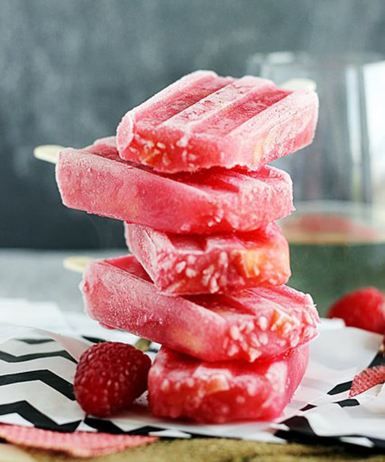 Raspberry Peach Champagne Popsicles: Forget the flutes and toast your guests with these fresh, seasonally inspired popsicles by Beyond Frosting! Filled with summery raspberries and peaches, and a splash of champagne, these will be a huge hit at any festive occasion!