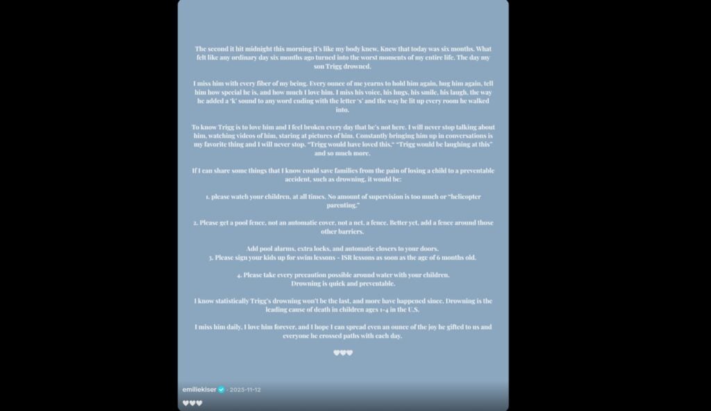 In May 2025, influencer Emilie Kiser and her husband, Brady Kiser, lost their son, three-year-old Trigg Kiser. He drowned in the family’s backyard pool while Emilie was away from the home and he was under the care of Brady. Afterward, per a statement on Instagram, Emilie expressed that she took “full accountability” for what happened since she had not installed a fence around the pool.