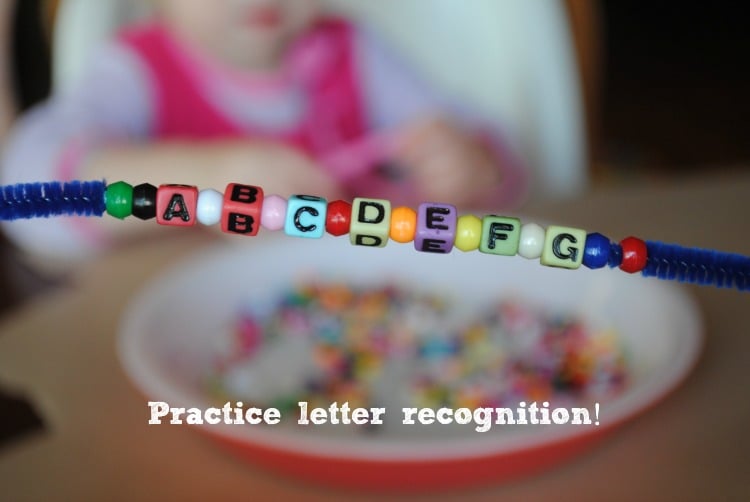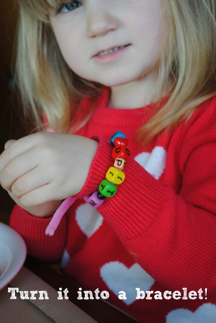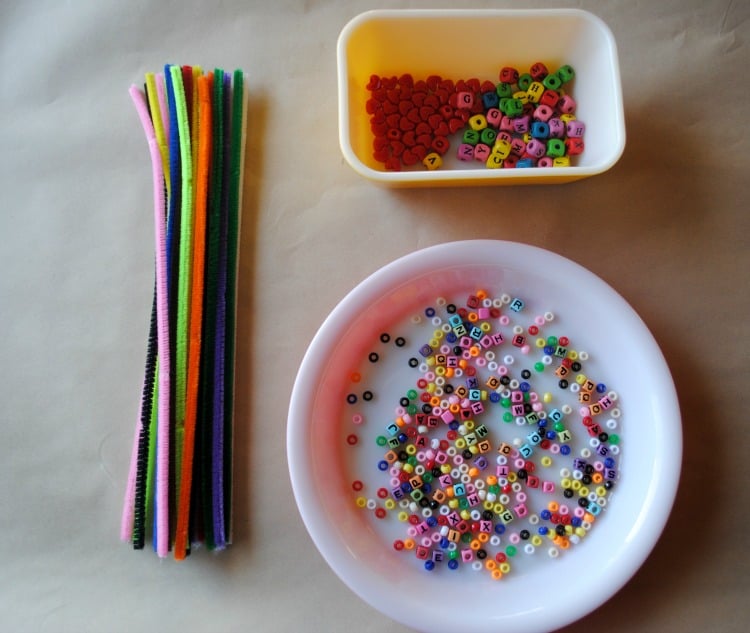 The more colorful everything is, the better (as always). Make sure the beads you use have big enough holes for the pipe cleaners to fit through. Most "kid" beads will work just fine. We used a mix of beads we had on hand: some small plastic beads, some heart-shaped pony beads and some wooden alphabet beads. We had fun practicing the alphabet and spelling out words while we were at it. This is a perfect afternoon activity for little ones with busy fingers.