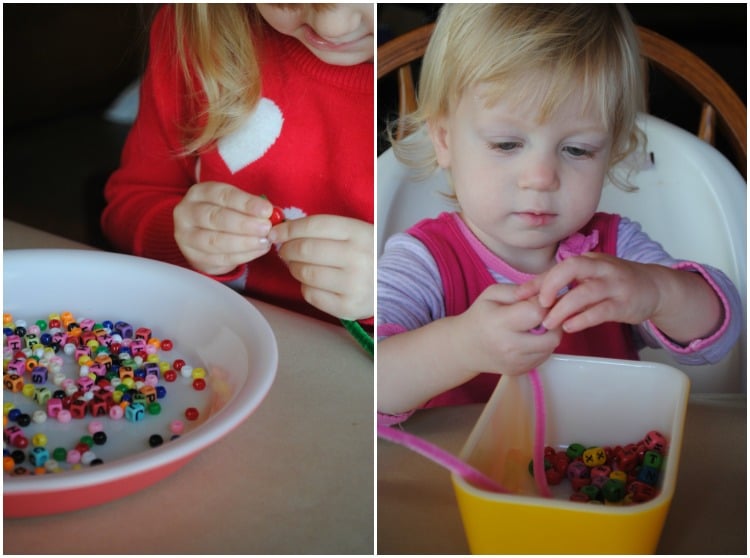 Ingrid—my youngest—loved feeling the beads fall through her fingers into the bowl, and Adair—my oldest—wanted to make "bracelets" all afternoon long. Best of all, this activity is super cheap to put together and one of the best activities I've found for practicing hand-eye coordination, which is one of the most important fine motor skills for wee ones.
