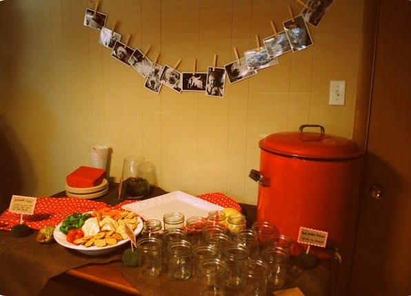 The food and dessert tables were so much fun. I used brown burlap fabric and red polka-dotted wrapping paper to cover the tables. A simple "clothesline" of black-and-white photos from my daughter's first year hung above. I served food in brown kraft paper compostable dishes and borrowed mason jars from my grandma to use for the drinks.