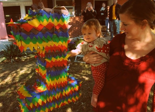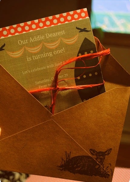 We only had two party games: a piñata (which I made from old boxes and tissue paper) and a photo booth. We used real deer antlers and other fun props for the photo booth, which was lined in the same polka-dot wrapping paper I used for the tables. The invitations were adorable, too. I made them myself using PicMonkey, then tied them with red raffia and stuffed them in kraft paper envelopes, complete with a deer stamp.
